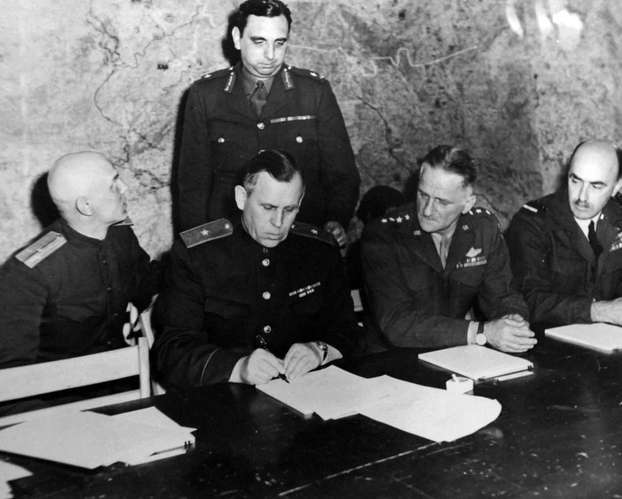 This, the unconditional surrender of the German Third Reich was signed in the early morning hours of Monday, May 7, 1945; the time on the documents is noted as 02.41 hours, or 2:41 A.M. The scene was the war room at SHAEF (Supreme Headquarters, Allied Expeditionary Force), located in the Professional and Technical School at Reims, a historic city in northeastern France that had been almost completely leveled by the Germans during the war. Across the conference table, representatives of the four Allied Powers – France, Great Britain, the Soviet Union, and the United States – faced the three German officers delegated by Adm. Dönitz: Col. Gen. Alfred Jodl, who alone had been authorized to sign the surrender document; Gen. Adm. Hans Georg von Friedeburg, a chief negotiator; and Maj. Friedrich Wilhelm Oxenius, an aide to Jodl.