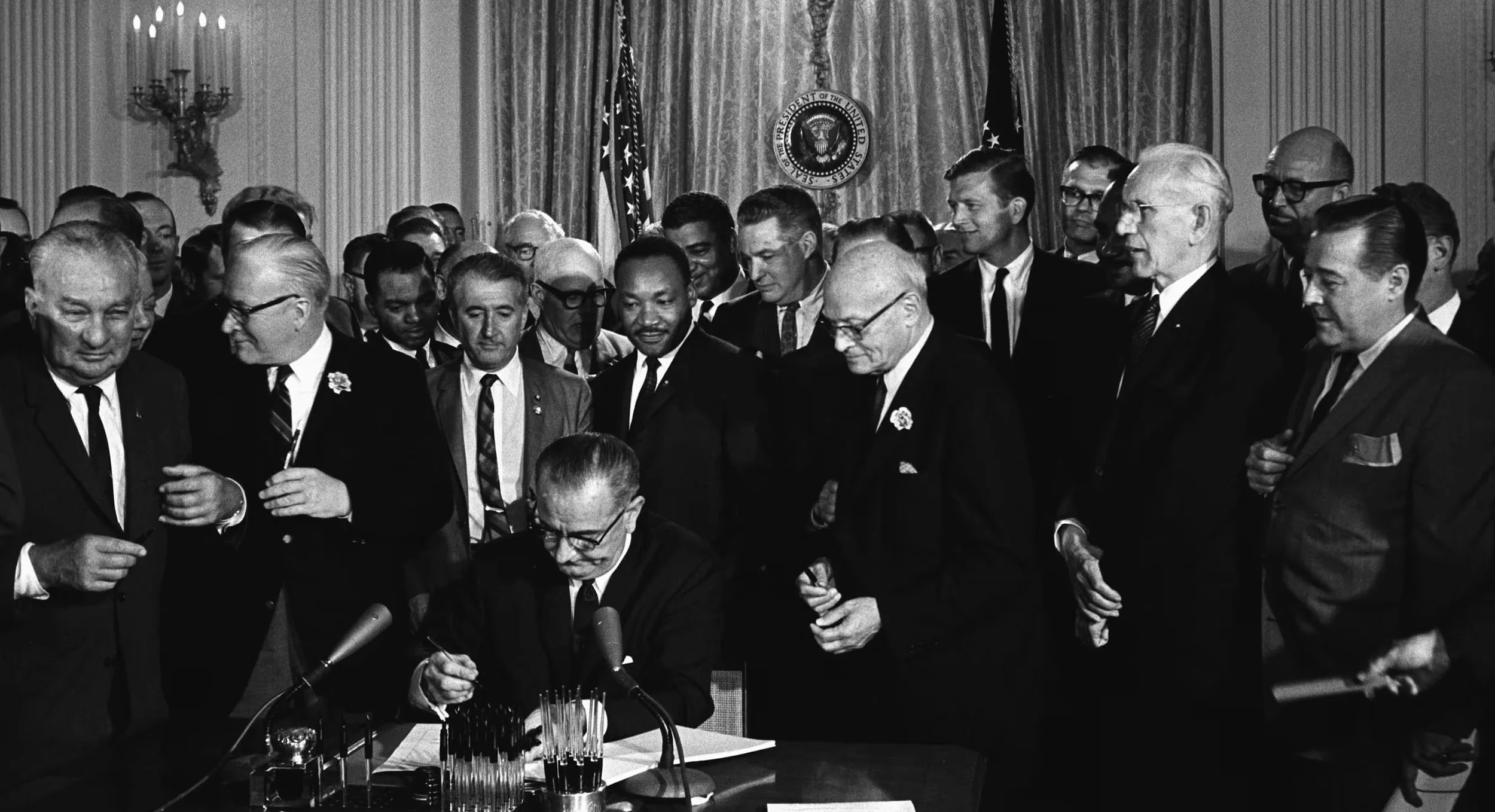 An Esterbrook dipping pen that was used by President Lyndon B. Johnson when signing the landmark Civil Rights Act of 1964 (H.R. 7152). The bill-signing pen features a black plastic grip with a Lucite handle imprinted with "The President—The White House."